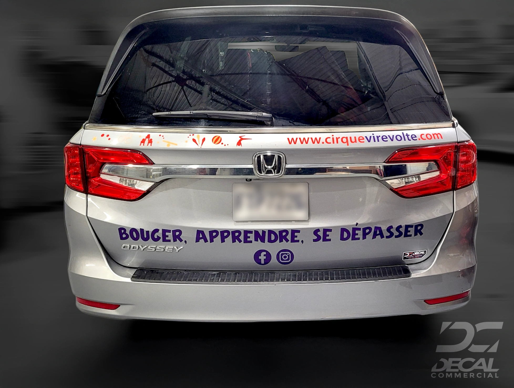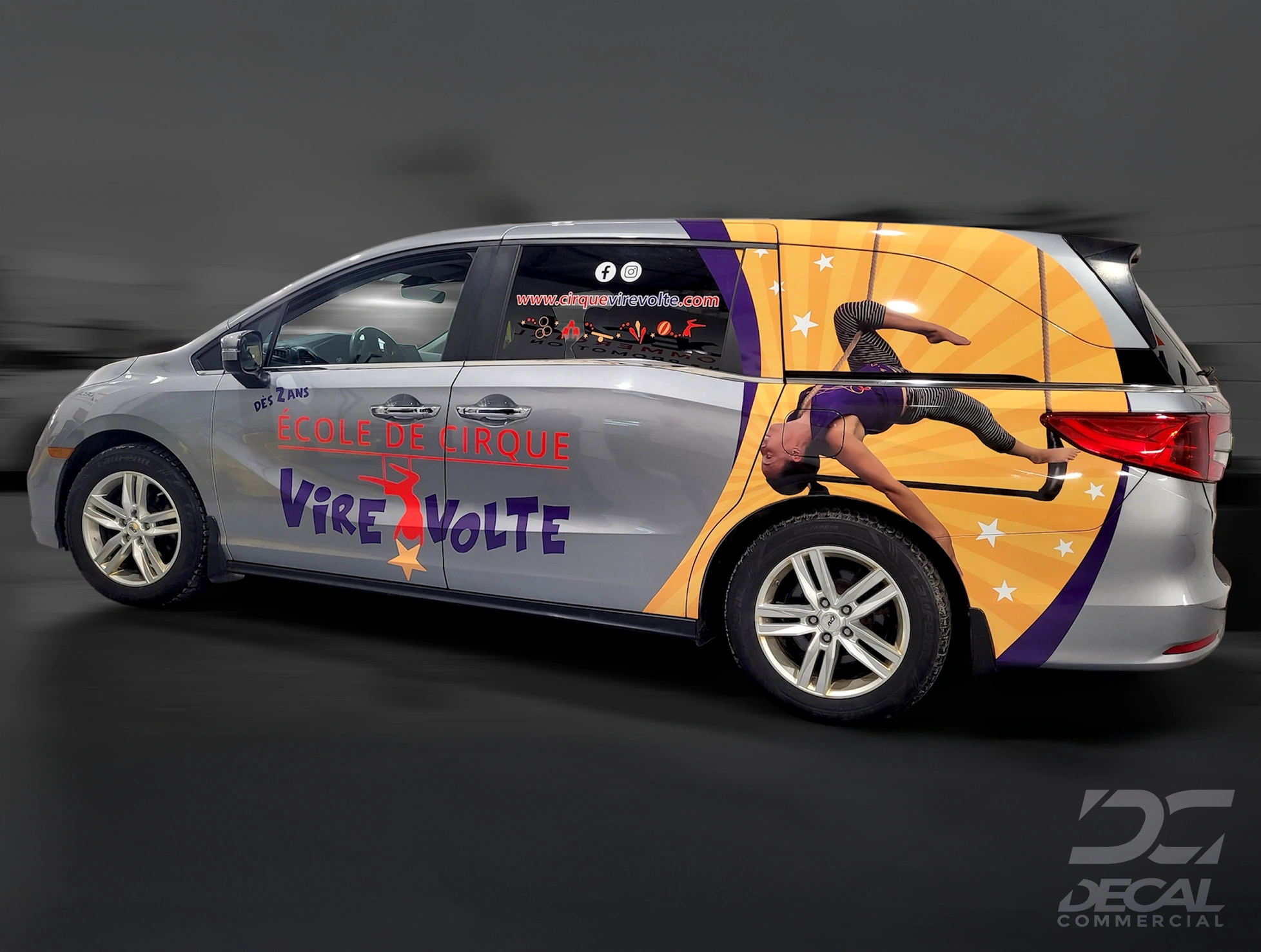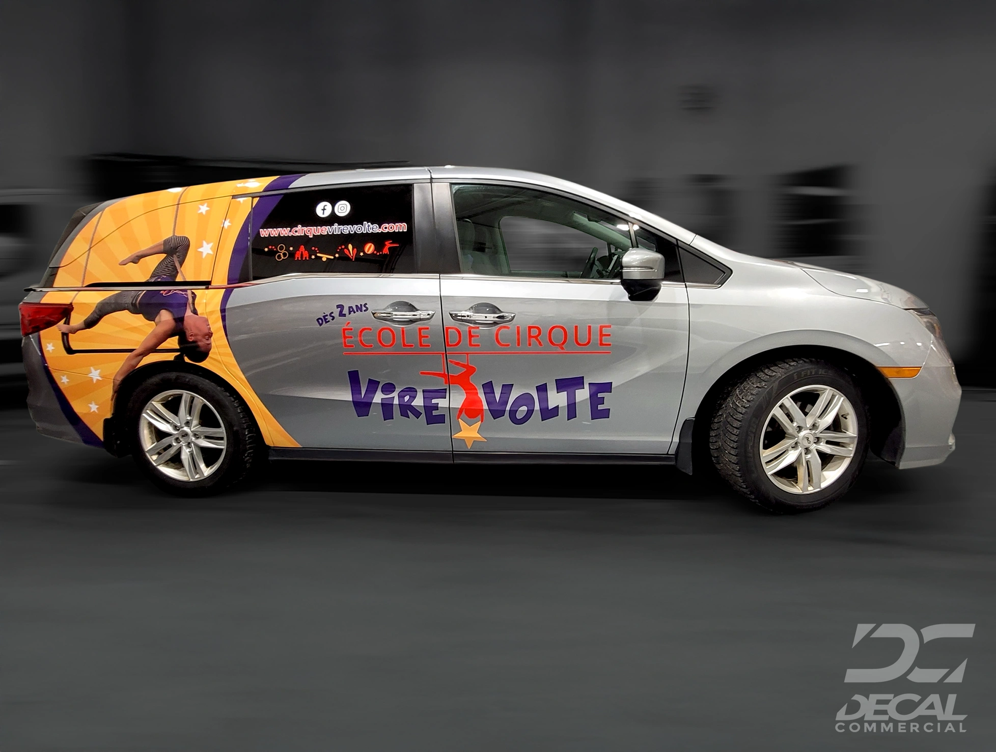 Pour cette réalisation, notre équipe a effectué un habillage partiel d’un minivan pour une école de cirque. Le but était d’élaborer une image dynamique et attrayante, qui illustre l’énergie et la créativité de l’école.
