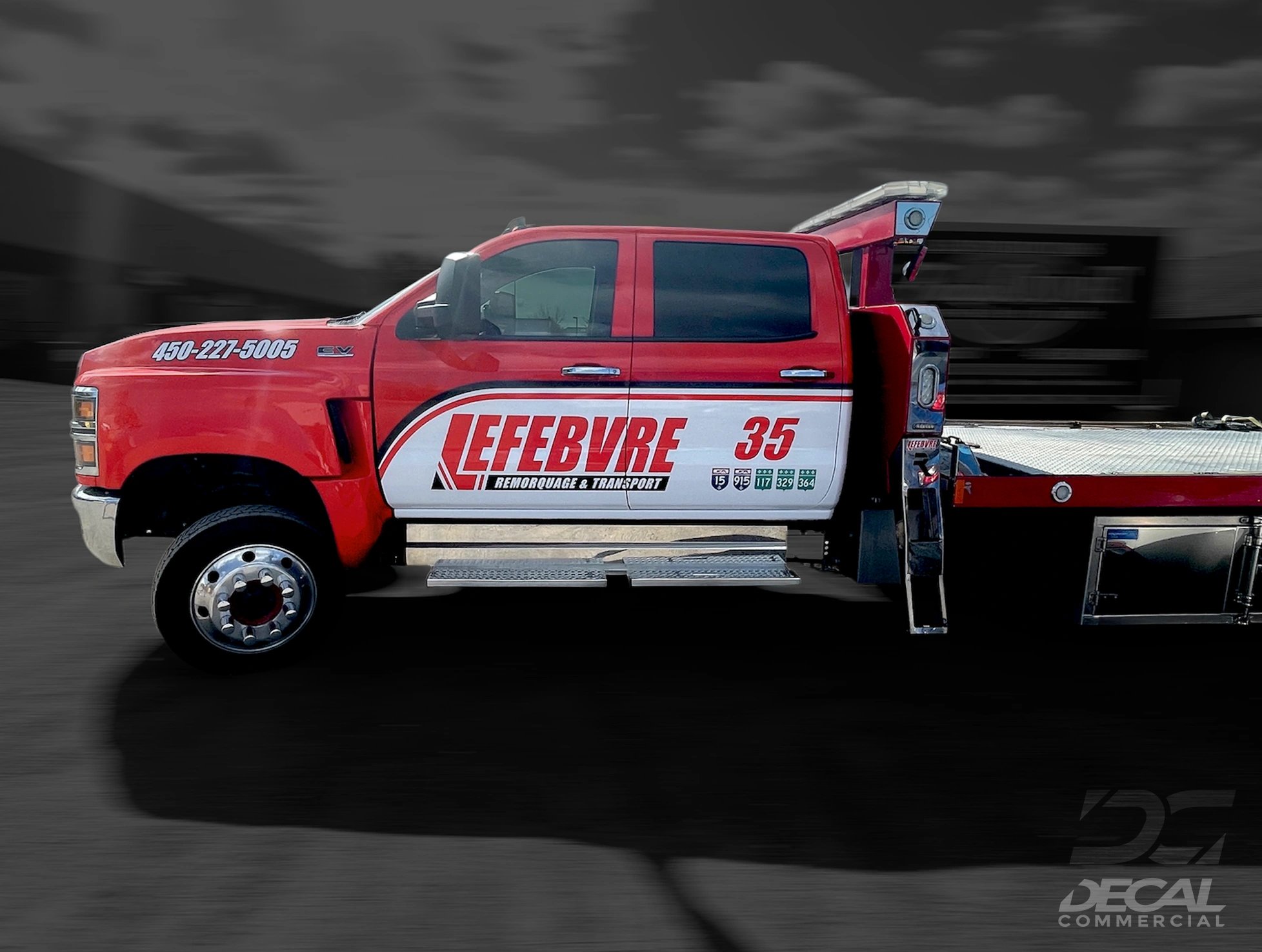 Pour ce mandat, notre équipe a mis en place un habillage partielle sur deux remorqueuses, appliqué au bas des portes de la cabine, créant un effet qui semble s’intégrer dans la carrosserie. Le design du visuel illustre un dynamisme avec des lignes de deux couleurs sur un fond blanc incorporant une courbe descendante tout en intégrant le logo.